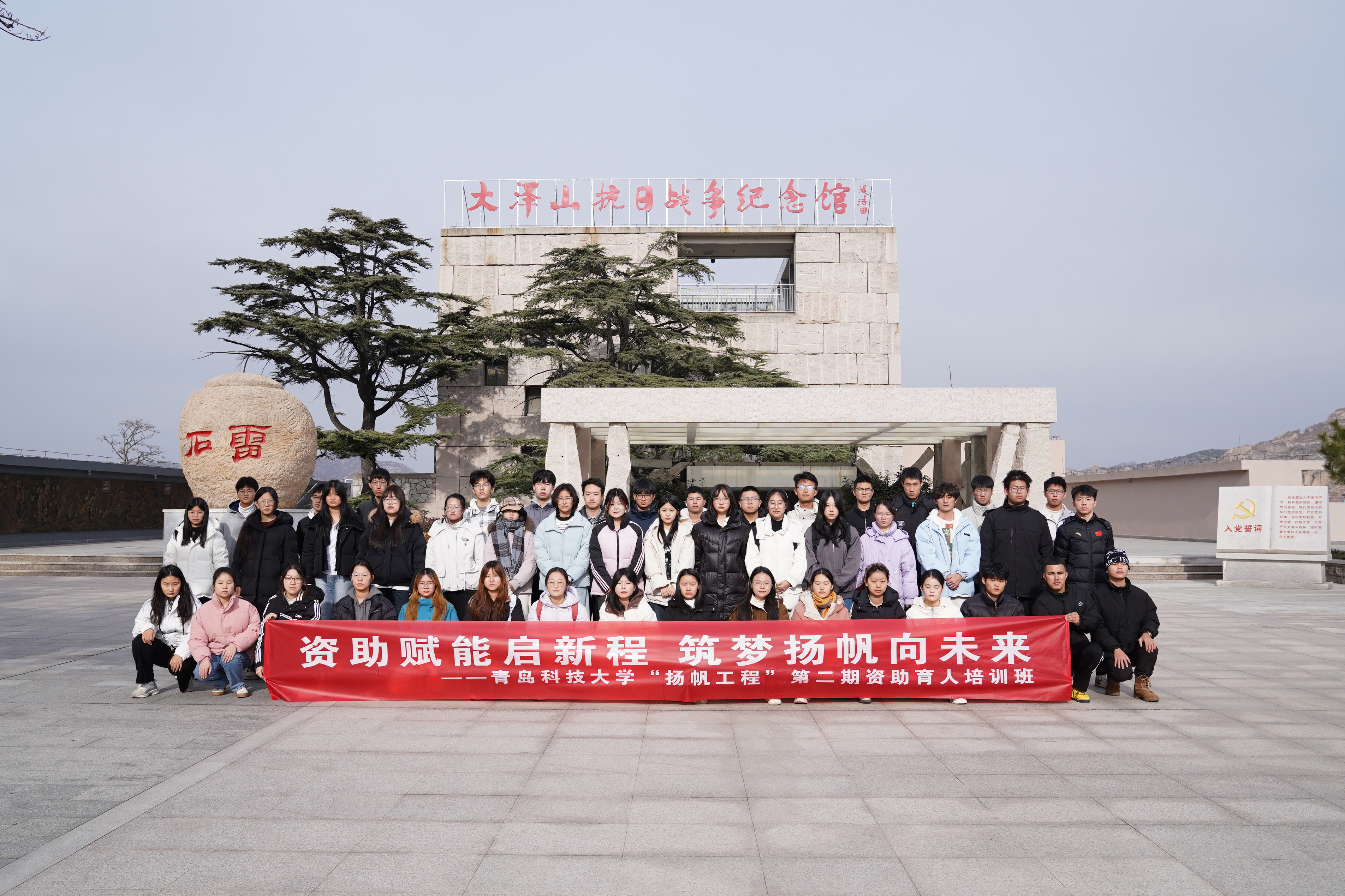 12月20日上午,培训班走进平度大泽山抗日战争纪念馆。在讲解员引领下,学生们认真聆听大泽山抗日根据地的战斗历史,端详文物史料、珍贵照片和战斗场景复原模型,深切感悟革命先辈的家国情怀。自动化学院的张同学感慨:“身边的抗日故事如此壮烈,先辈勇气令人敬佩,吾辈当应更加自强”。现场“红色故事分享会”上,同学们结合参观感悟交流心得,在思想碰撞中厚植爱国情怀,增强历史责任感。户外素质拓展环节,“鼓舞人心”“汉诺塔”“激情挑战”等一系列精心设计的拓展项目依次开展。在专业教练的指导下,同学们分组协作闯关,从紧张胆怯到默契配合,顺利完成各项挑战。机电学院赵同学表示,通过项目深刻体会到“团结就是力量”,改变了独自承担事务的习惯,认识到团队协作的高效价值。