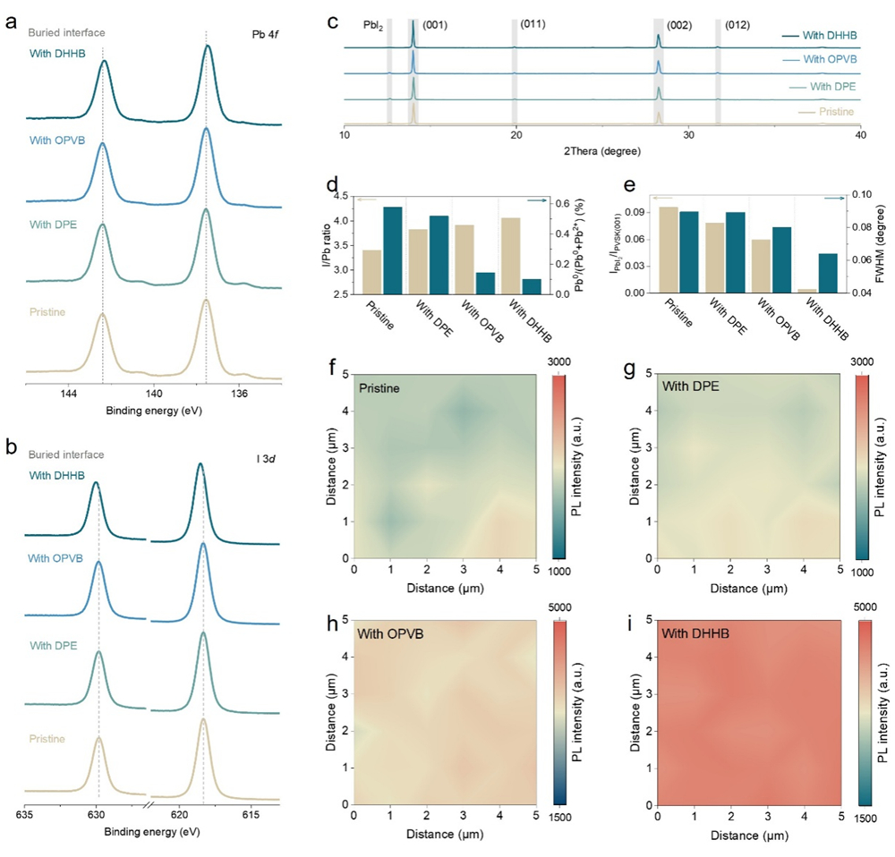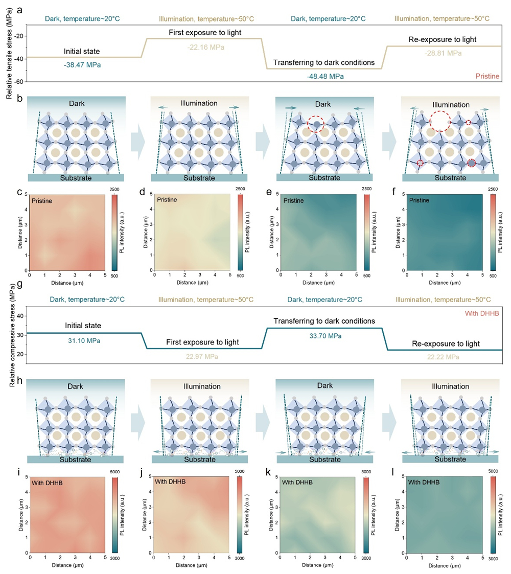 为此,周忠敏教授团队联合中科院青岛能源所逄淑平研究员、东南大学李崇文教授、上海交通大学王言博教授提出了一种针对钙钛矿太阳能电池埋底界面的构象工程策略,通过从1,1-二苯乙烯逐步演化为1-辛基-2-(1-苯基乙烯基)苯和二乙氨基羟基苯甲酰己基苯甲酸酯,构建了一个多功能分子系统。该研究系统解耦了这些添加剂在紫外屏蔽、应变调控和化学钝化方面的独立贡献,并结合原位表征技术揭示了光暗循环过程中动态界面应变调控对提升器件稳定性的关键作用。所制备的器件在0.09平方厘米和20.5平方厘米有效面积下分别实现26.47%和22.67%的光电转换效率,并在ISOS-L-II连续光照测试1132小时后保持96.2%的初始效率,在ISOS-LC-1昼夜循环测试348小时后保持88.8%的效率。该研究为通过构象工程驱动的多功能策略设计高稳定性钙钛矿太阳能电池提供了创新范式。