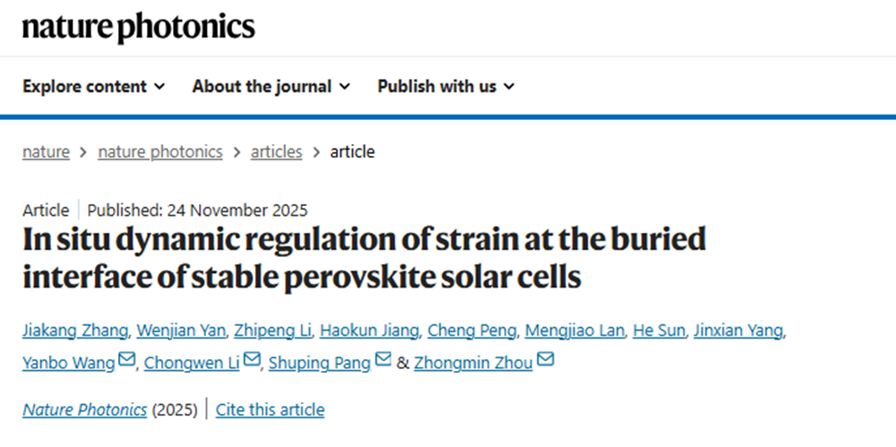 11月24日,欧博abg官方网站化学与分子工程学院、高性能有机光学聚合物与先进制造全国重点实验室周忠敏教授团队在Nature Photonics期刊发表题为“In situ dynamic regulation of strain at the buried interface of stable perovskite solar cells(稳定钙钛矿太阳能电池埋底界面应变的原位动态调控)”的研究论文。