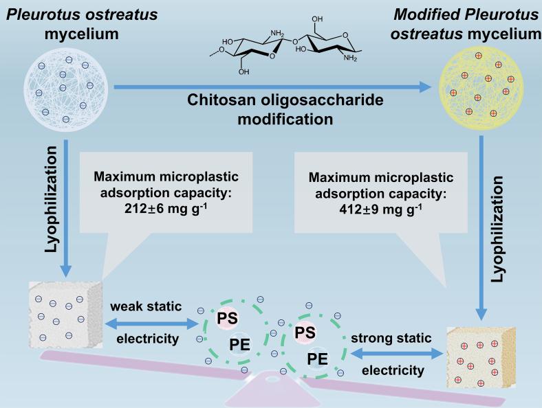 针对水中微塑料的治理难题,团队创新性地提出了一种基于改性可食用真菌平菇的去除方法,选用绿色可食、经济易得的平菇菌丝体构建微塑料去除框架,以天然物质壳聚糖和柠檬酸对其改性,得到改性菌丝体(M-PM)海绵。1 g M-PM可去除412.42±9.14 mg MPs,常温下,其对自来水样品中MPs的去除率高达68.8%,对其他水样的去除率也可达60.1%~67.4%。该材料的优异性能主要源于内部的结构交联与表面的阳离子化修饰。此外,M-PM具备良好的生物相容性,整个制备和使用过程绿色无污染。相关研究成果以题为《Chitosan oligosaccharide-modified Pleurotus ostreatus mycelium for microplastic removal based on the green design concept》的论文,发表于国际期刊《Industrial Crops and Products》(JCR一区,IF=6.2)。论文第一作者为生物工程学院硕士研究生董新睿,欧博abg官方网站为第一单位,通讯作者为王霞副教授。