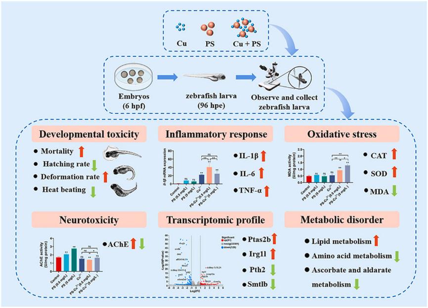 微塑料毒性评估模型系统评估了10μm聚苯乙烯微塑料(PS-MPs)与铜(Cu)联合暴露对斑马鱼幼鱼的急性毒性效应。结果证实,联合暴露会诱导斑马鱼产生发育毒性、免疫毒性、神经毒性,并引发氧化应激与代谢紊乱,且两者表现出显著的协同毒性效应。该研究首次揭示了微塑料与铜对斑马鱼幼鱼的急性联合毒作用机制,相关成果以题为《Polystyrene microplastics (PS-MPs) harness copper presence and promote impairments in early zebrafish (Danio rerio) larvae: Developmental, biochemical, transcriptomic approaches and nontargeted metabolomics approaches》的研究论文,发表于国际期刊《Environmental Research》(JCR一区,IF=7.7)。论文第一作者为生物工程学院硕士研究生张丽巧,欧博abg官方网站为第一单位,通讯作者为王霞副教授。