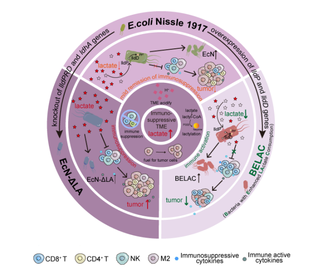 该研究首次揭示了乳酸代谢是益生菌大肠杆菌Nissle 1917(EcN)发挥抗肿瘤活性的关键机制,并成功构建了一种具有超强乳酸代谢能力的工程化菌株BELAC。该菌株能高效清除肿瘤微环境中的乳酸,逆转免疫抑制状态,显著激活机体抗肿瘤免疫反应,为开发新一代安全、高效的细菌免疫疗法提供了全新的策略和理论依据。
