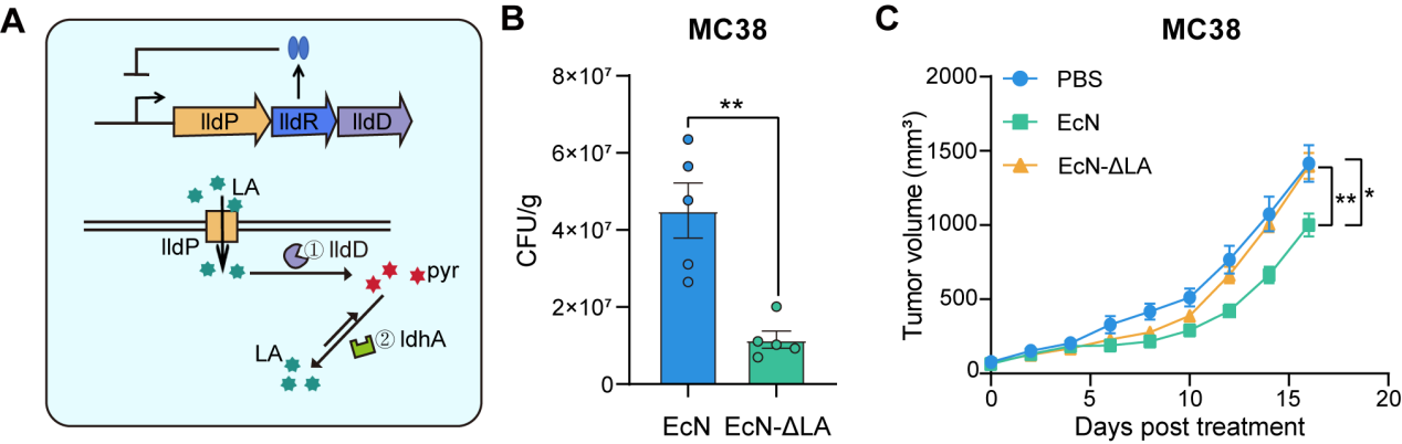 EcN是一种具有悠久临床应用历史的益生菌,安全性高且具备天然的肿瘤归巢能力。然而,其内在的抗肿瘤机制一直未完全阐明。研究团队首先通过基因编辑技术,构建了乳酸利用缺陷型EcN菌株(EcN- ΔLA)。实验结果显示,一旦丧失了利用乳酸的能力,EcN在肿瘤内的定植能力严重受损,抗肿瘤效果也完全消失。这一关键实验确凿地证明:乳酸代谢不仅是EcN在肿瘤内生存的“食物来源”,更是其发挥抗肿瘤功能的核心机制。