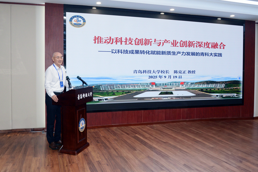 陈克正在会上作了题为“推动科技创新与产业创新深度融合——以科技成果转化赋能新质生产力发展的青科大实践”的主旨报告。报告介绍了学校的历史沿革和发展历程,从“发挥学科优势特色,夯实政产学研根基”“深化体制机制改革,释放成果转化效能”“创新人才培养模式,培育拔尖创新人才”三个方面,系统阐述了学校通过“科技创新与产业创新深度融合”推动高质量发展的路径与成效。报告指出,多年来,学校不断夯实政产学研根基,以橡胶、化工等优势学科为核心,动态优化专业布局,构建“基础研究-应用开发-产业化”全链条科研支撑体系;深化体制机制改革,打造“青科大模式”升级版,破解成果转化“不愿转、不敢转、不会转”难题;创新“橡胶品格育英才”模式,通过“3+1+2+N”卓越工程师培养、TPA创新创业教育等,培育适配产业需求的拔尖人才。报告最后强调,学校将坚持“两服务一引领”,培养“创新型、复合型、国际化”的高素质人才,建设“特色鲜明、走在前列”的高水平大学而不懈努力。