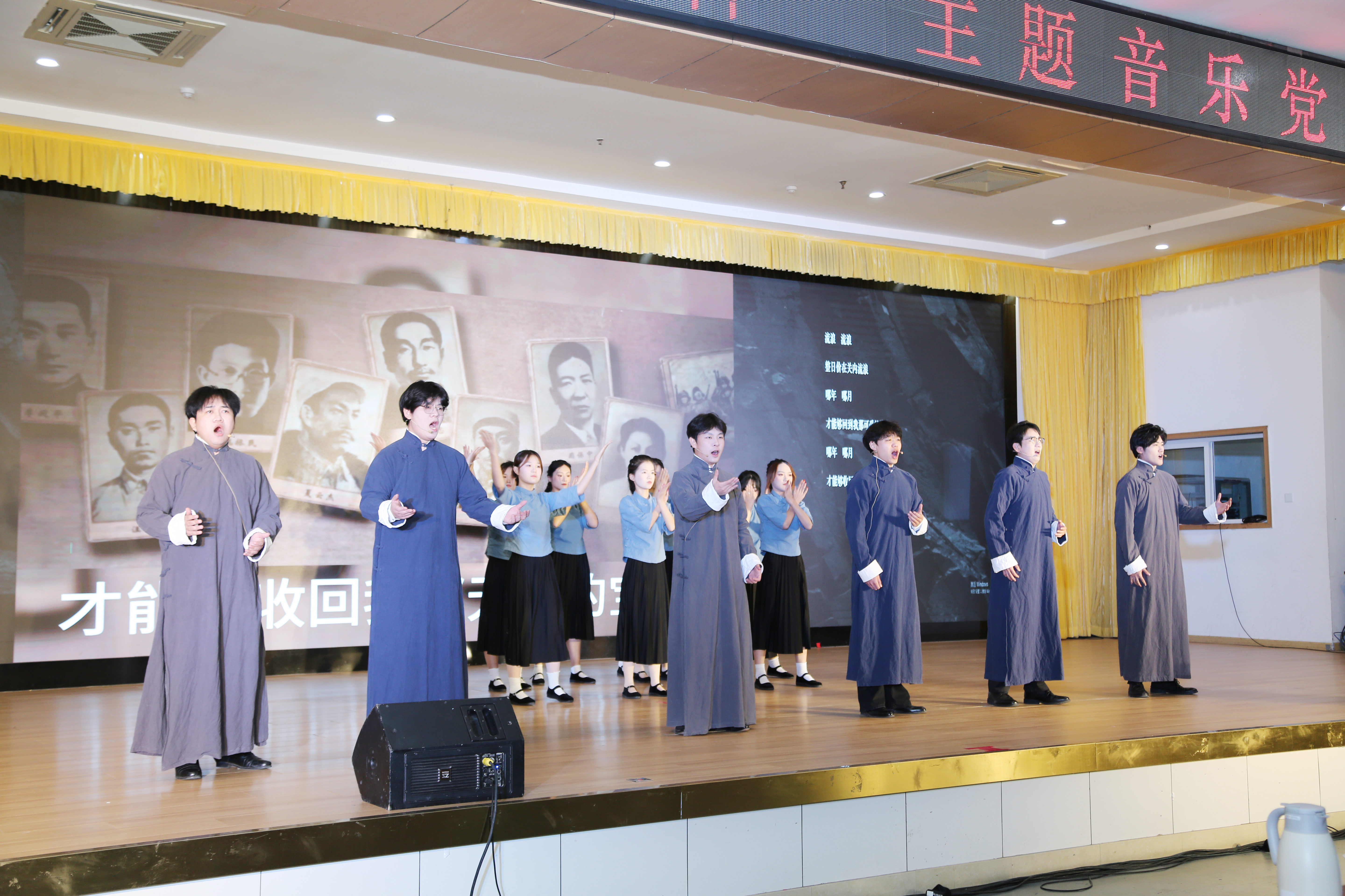 “弘扬伟大抗战精神”主题音乐党课共分为“民族危亡 挺起脊梁”“思想指引 全民抗战”“鱼水情深 英雄沂蒙”三个篇章。课上,红润初心工作室“音为爱”红歌团采用独唱、二重唱、合唱、混声合唱等艺术形式,通过10首经典歌曲情景再现英勇抗战历史,展现中国共产党团结带领中国人民抗击日本帝国主义侵略的壮丽史诗。
